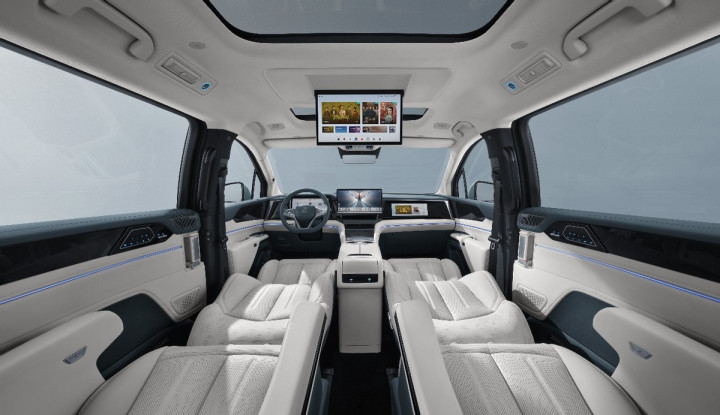 此外,W-HUD抬头显示、前排座椅加热、通风、按摩、记忆以及支持4向电动调节、通风、加热、按摩、腿托的二排座椅,在最大程度上保证了车内驾乘人员的舒适性,加之15.6英寸的吸顶娱乐屏、后排全景天幕+遮阳帘等配置的赋能,无论是商务接待时的体面感,还是家庭长途出行时的乘坐体验,都得到了全方位的保障,完美契合了中大型新能源MPV宜商宜家的核心定位。